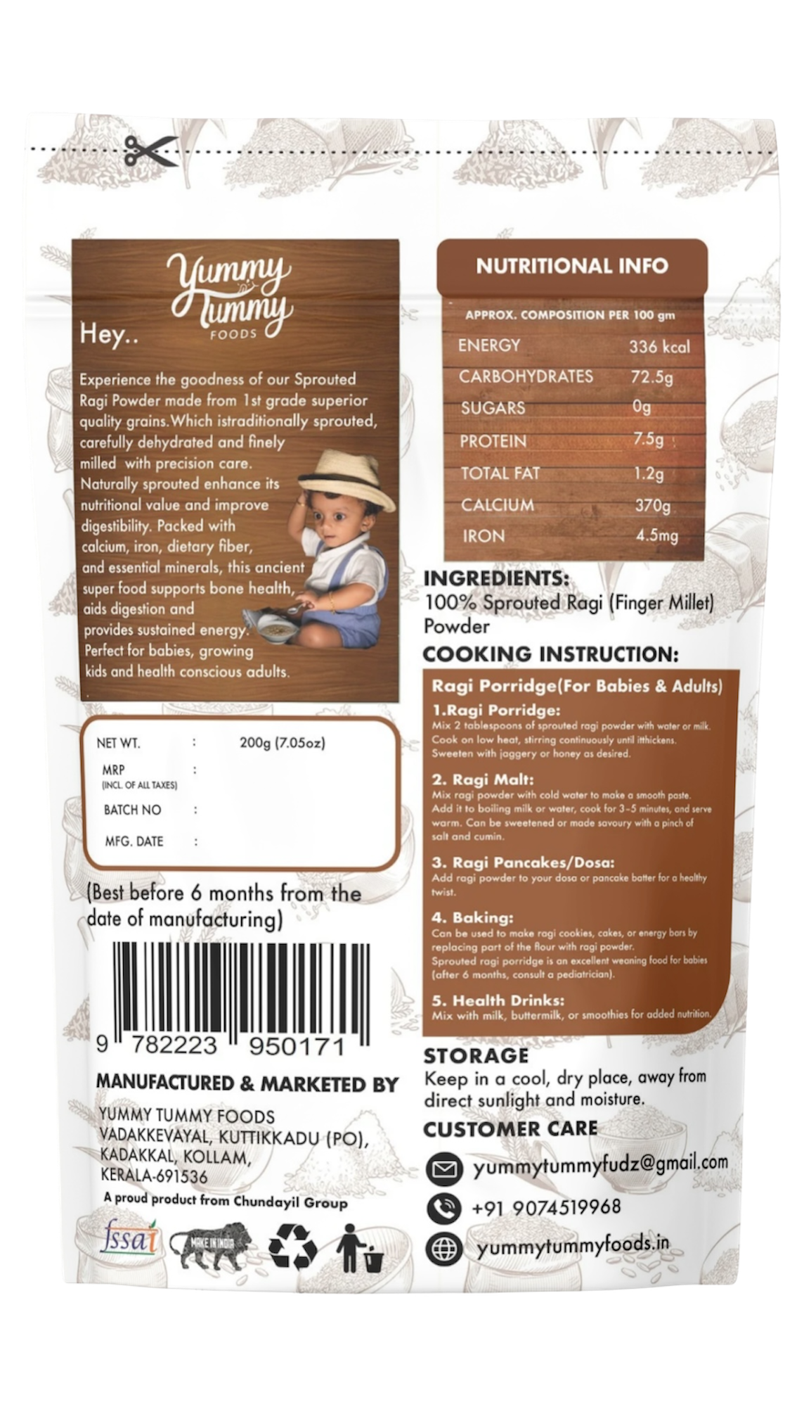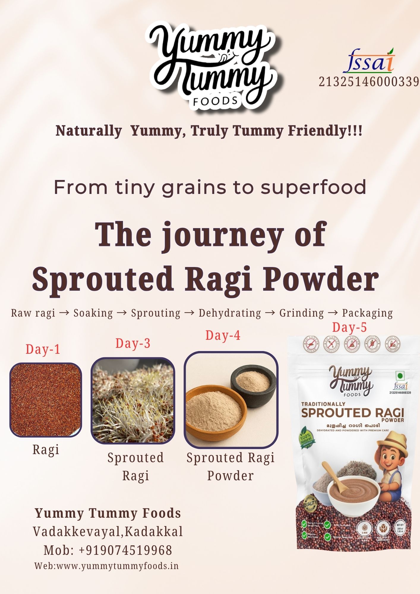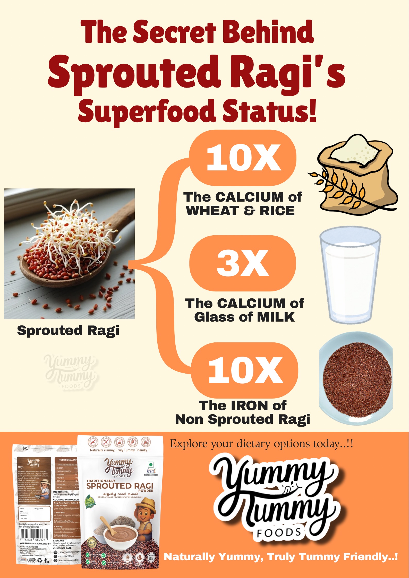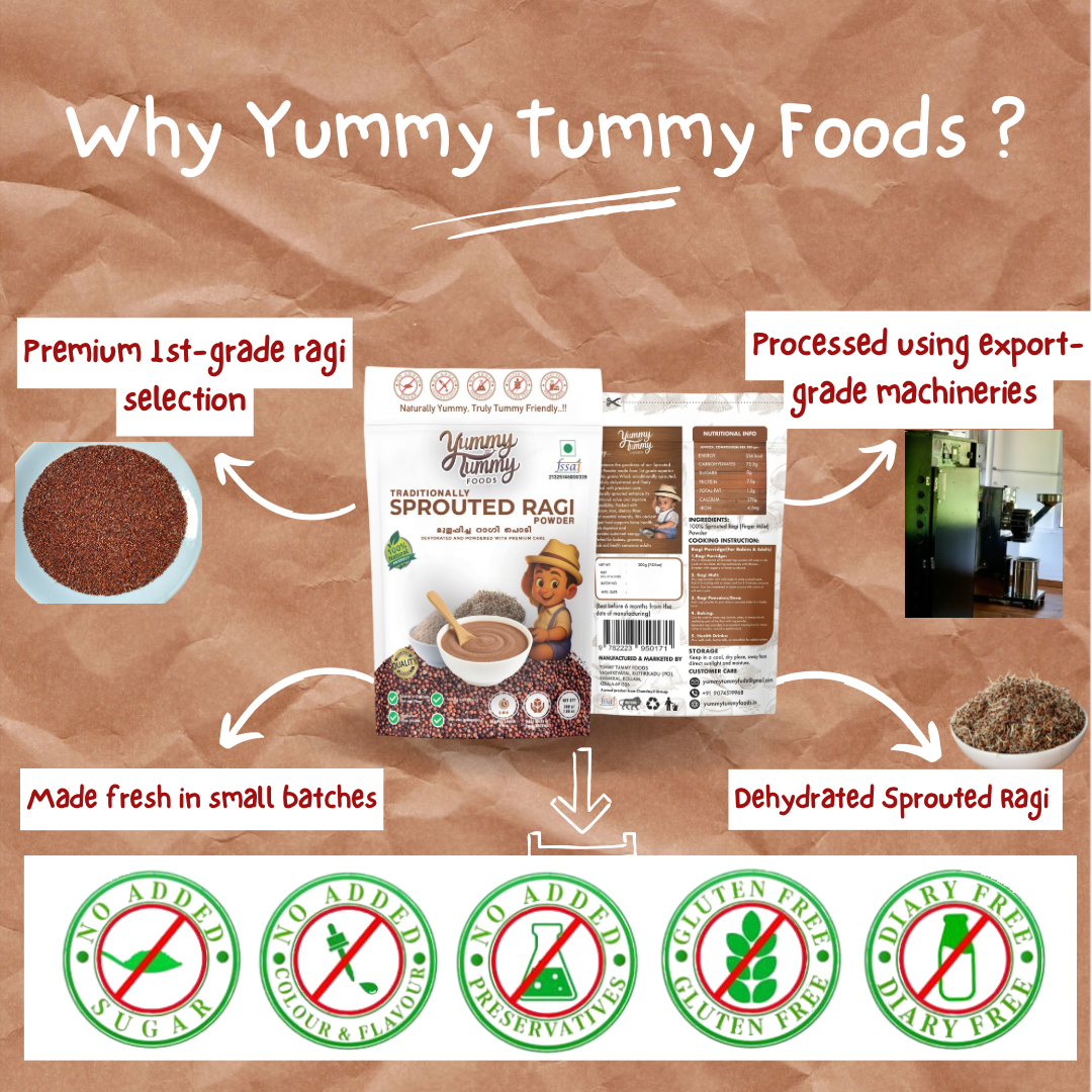 Discover the wholesome nutrition of Yummy Tummy Foods Sprouted Ragi Powder, crafted from premium quality ragi grains that are soaked, sprouted, dehydrated , and finely milled to preserve their natural nutrients. Sprouting enhances the bio-availability of calcium, iron, and protein, making it a perfect natural superfood for babies, kids, and adults alike. Ideal for porridge, dosa, smoothies, or health drinks.